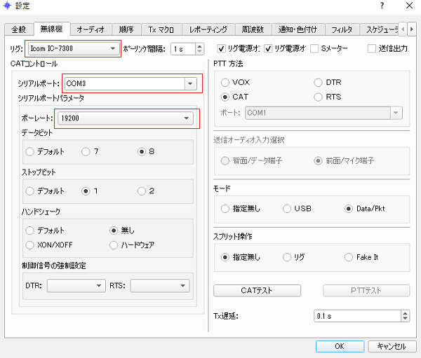2.無線機「Radio」は、Rig, Serial Portなどを設定します。
