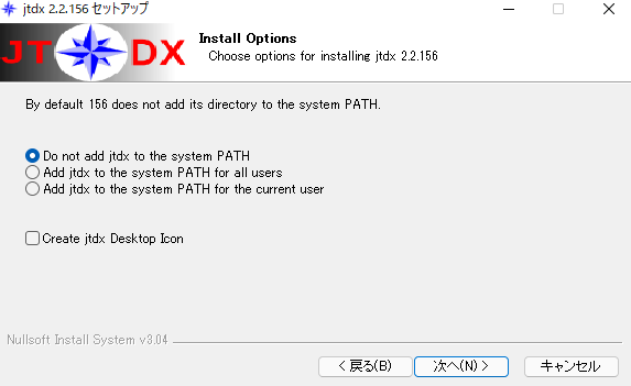 3.「Do not add jtdx to the system PATH」にチェックを入れ「次へ」をクリックする。