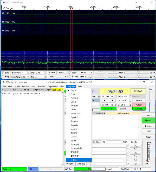 ここで言語を日本語に設定します。次の設定が完了し、IC-7300と接続されていれば受信を開始します。