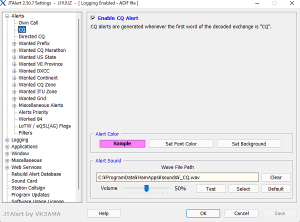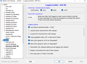 「log.adi」は、画面の「Log File」の「Create New」ボタンをクリックすると、新規に作成されます。WSJT-XやJTDXで既にQSOしたログがある場合には、WSJT-XやJTDXのログ「wsjtx_log.adi」をコピーして、コピーの名前を「log.adi」に変更して、JTAlertのログファイルがある上記のフォルダーへ入れます。画面の「Log File」の「Select」ボタンをクリックして、「log.adi」を指定します。