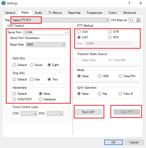 ・ドライバーソフトを削除して再インストールしても動作しない。 (COMxの番号は上がっていく) ・古いバージョンに戻すと動作した。 ・WSJT-X-2.2.2では、下図のように無線機をFT-857に指定すると動作した。 |