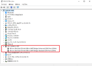 (2)仮想COMポートドライバーのダウンロードとインストールを行います。 ドライバーソフトは、付属マニュアルにあるWebサイトからダウンロードしインストールします。インストール完了後、USBケーブルをパソコンに接続します。正常にインストールが完了すると以下のように仮装COMポートが表示されます。COMポートの番号は、インストールするパソコンによって変わってきます。以下の例では、COM4とCOM5にアサインされています。 |