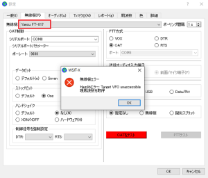 (7)WSJT-X-2.2.2でFT-817が動作しなくなった。 下図のように無線機エラー Hamlibエラーが表示されてCAT通信がエラーとなった。 |