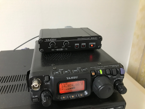 | (1)SCU-17 (USBインターフェースユニット )をFT-817の上に置いてみました。 SCU-17は、FT-817の半分弱のサイズ感です。SCU-17からは、ケーブルが3本出ています。 |