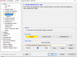 | (1)JTAlertのSettingsからManage Settingsをクリックします。 Wanted DXCCを選択して、Wantedを検出した場合の音声出力を設定します。 @Defaultで_DX.wavを設定します。Testをクリックすると「DX」と音声出力されます。 |