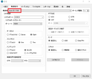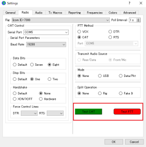 | 1.WSJT-XのSettingsの「Radio」で、接続が正常であれば、「Test PTT」をクリックするとIC-7300が送信状態になることが確認できます。もう一度「Test PTT」をクリックするとIC-7300が受信状態に戻ります。 |