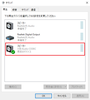 (3)正常にドライバーがインストールされるとスピーカーUSB Audio CODECが追加されます。 送信用(Output)に使用します。 |