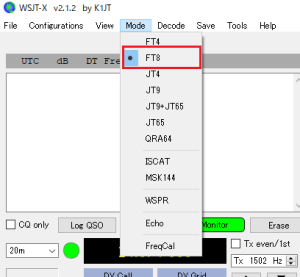 (2)Modeを変更します。 Modeのディフォルトは、FT8になっていません。このままではデコード出来ないのでFT8に変更します。 ※Settingは設定しなくても受信は出来ると思います。 |