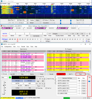 | JTDX / WSJT-Xで設定の無線機の項目で、スプリット操作にて「Fake it」や「疑似スプリット」にすれば解決できます。 送信時に周波数をシフトさせて倍音信号をフィルターにかけて出さないようにします。送信時に周波数が変動するのは正常です。 これをやれば高調波を出さずにすみますし、3kHz内のどこを選んでも出力も安定するとの事です。 |