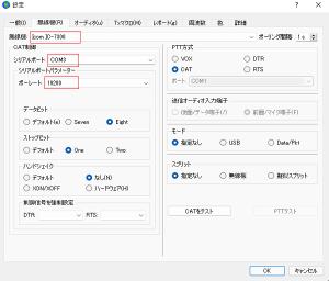 2.無線機「Radio」は、Rig, Serial Portなどを設定します。 Serial Portは、デバイスマネージャーを参照してメモしたCOM3を指定します。 |