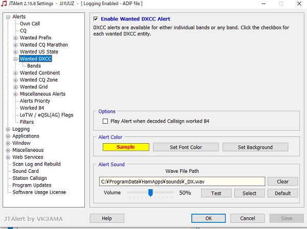 (1)JTAlertのSettingsからManage Settingsをクリックします。 Wanted DXCCを選択して、Wantedを検出した場合の音声出力を設定します。 @Defaultで_DX.wavを設定します。Testをクリックすると「DX」と音声出力されます。 |