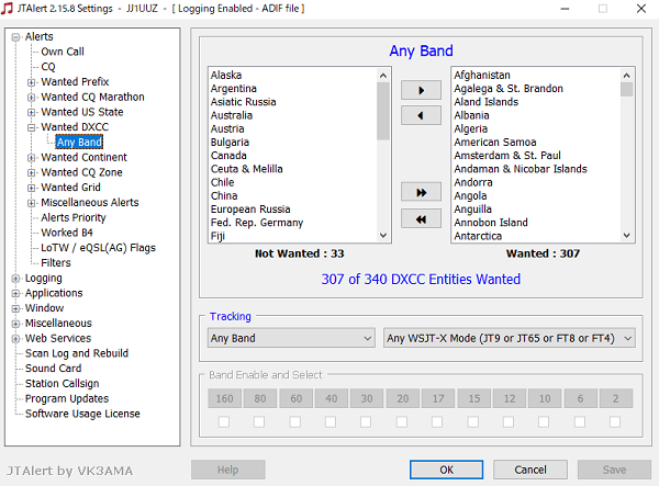 (2)Any Bandの設定を行う。 各バンド毎にも設定できますが、面倒なのでAny Bandで設定しました。 @一旦、全部のDXCC EntitiesをWantedへ移動します。 Aすでに交信したDXCC EntitiesをNot Wantedへ移動します。 |