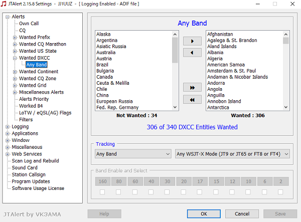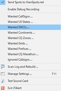 (3)未交信のDXCC Entitiesと交信が完了した場合 JTAlertのSettingsからWanted DXCCをクリックします。 |