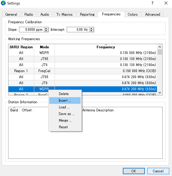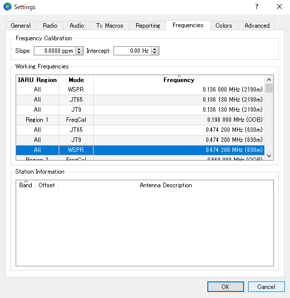 (1)WSJT-Xで「Settings」を開き、「Frequencies」タブをクリックし、以下のようにセルを選択します。 |