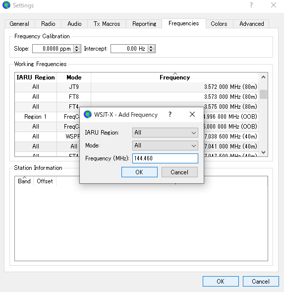 144MHz、430MHz、1200MHzでFT8を運用するには、WSJT-Xに選択する周波数を追加する必要があります。 |