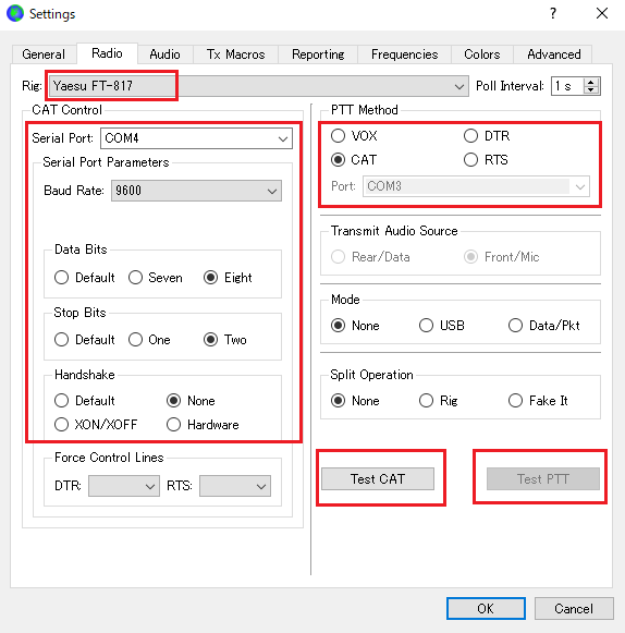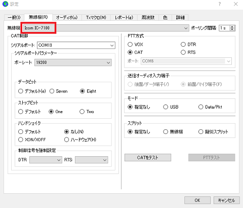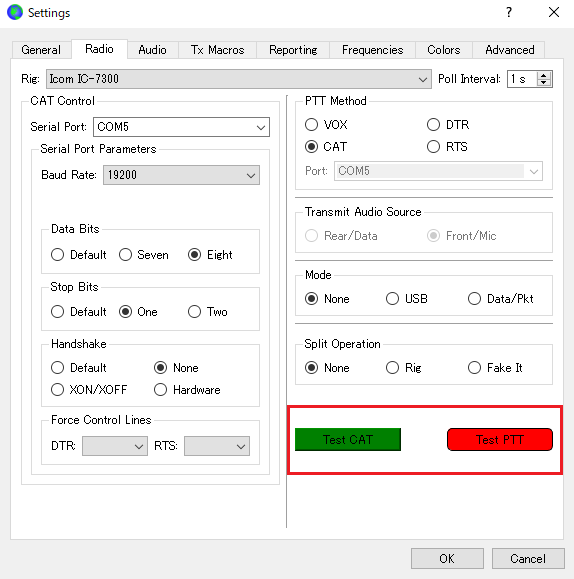 1.WSJT-XのSettingsの「Radio」で、接続が正常であれば、「Test PTT」をクリックするとIC-7300が送信状態になることが確認できます。もう一度「Test PTT」をクリックするとIC-7300が受信状態に戻ります。 |