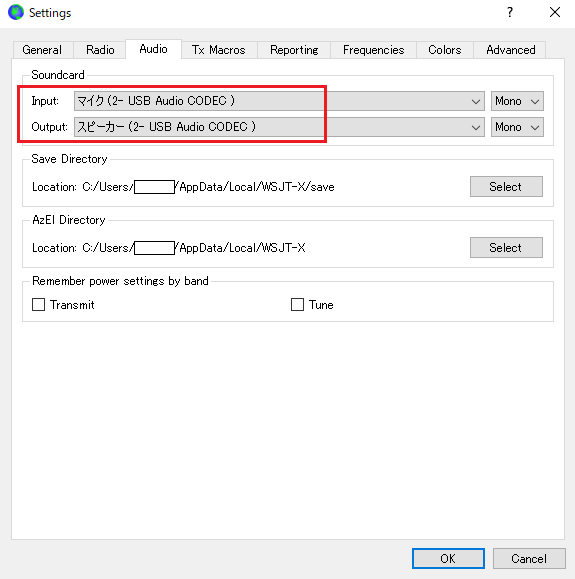 (6)Soundcardの設定を行います。 受信用(Input)および、送信用(Output)にUSB Audio CODECを指定します。 |