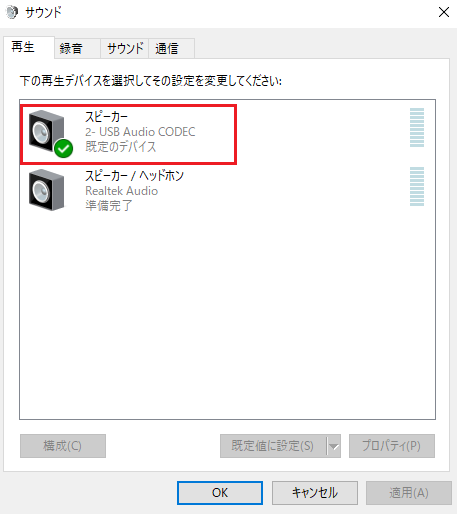 (3)正常にドライバーがインストールされるとスピーカーUSB Audio CODECが追加されます。 送信用(Output)に使用します。 |