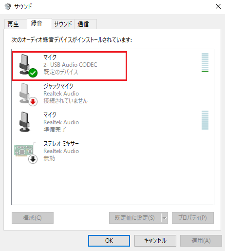 (4)正常にドライバーがインストールされるとマイクUSB Audio CODECが追加されます。 受信用(Input)に使用します。 |