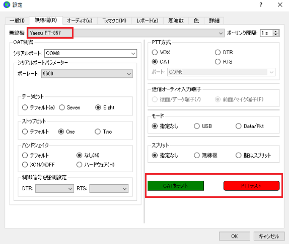 ・ドライバーソフトを削除して再インストールしても動作しない。 (COMxの番号は上がっていく) ・古いバージョンに戻すと動作した。 ・WSJT-X-2.2.2では、下図のように無線機をFT-857に指定すると動作した。 |