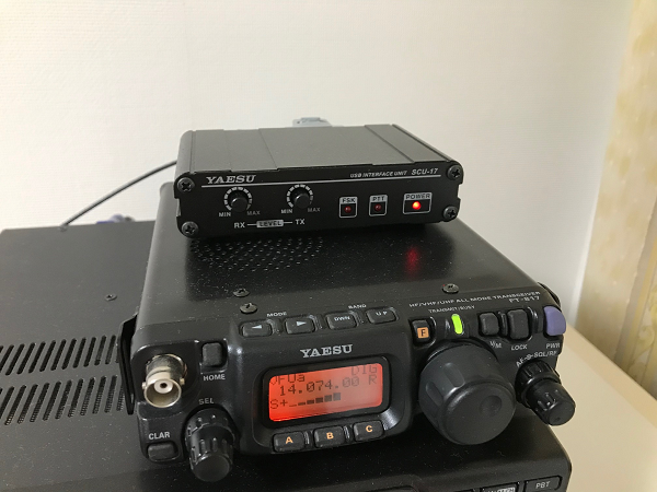 (1)SCU-17 (USBインターフェースユニット )をFT-817の上に置いてみました。 SCU-17は、FT-817の半分弱のサイズ感です。SCU-17からは、ケーブルが3本出ています。 |