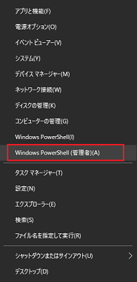 (1)左下のスタート(ウィンドウボタン)を右クリック --> Windows PowerShell(管理者)をクリックして、Windows PowerShell画面を表示する。 |