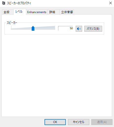 (4)「レベル」タブを開きます。 (5)「スピーカー」のレベルを適当な値に調整します。画面では「50」に設定してあります。 レベルを上げすぎるとオーディオ段階で歪んでしまうことがあるので注意が必要です。 |