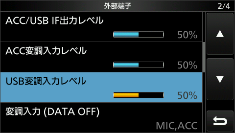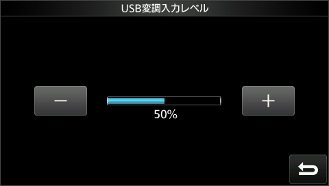(2)「USB変調入力レベル」をタップします。 「+」「-」をタップしてIC-7300の変調入力レベルを調整します。 |