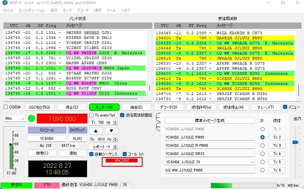 (2)画面に「WW DIGI」が表示されます この状態でCQ WW XXXXXの局をコールするとコンテストナンバーがグリッドロケーターになりました。周波数は、手動で無線機の周波数を指定周波数に移動しました。(赤色表示) |