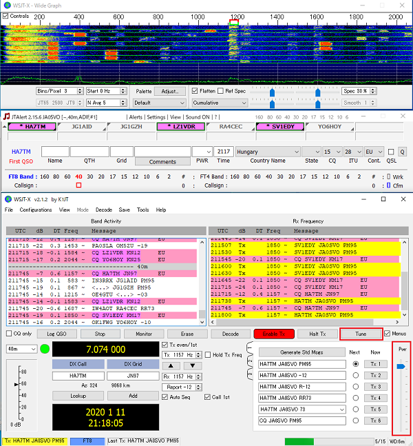 1・下図の「Tune」をクリックすると送信状態になります。 2.下図の「Pwr」で送信レベルを調整してALCが振れないように調整します。 3.バンドを変えて各バンド大丈夫か確認してみる。 |