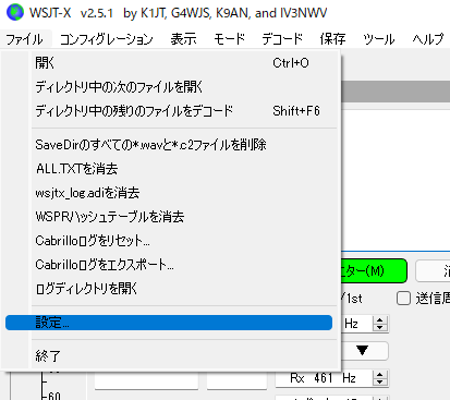 WSJT-Xが起動中に「ファイル」→「設定」をクリックします。